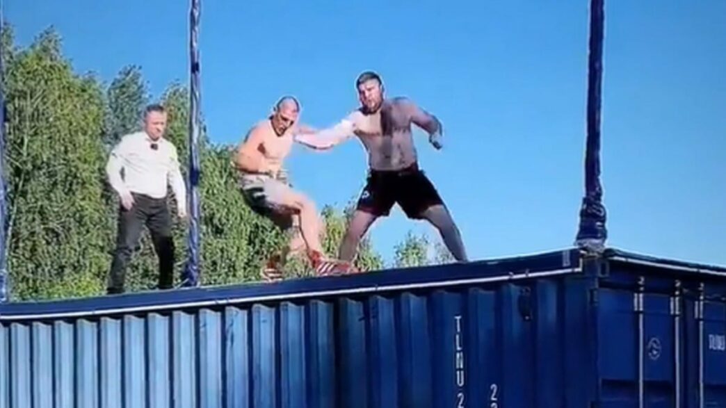 WTF – Ces fighters s’affrontent sur le toit d’un conteneur suspendu au dessus d’un lac