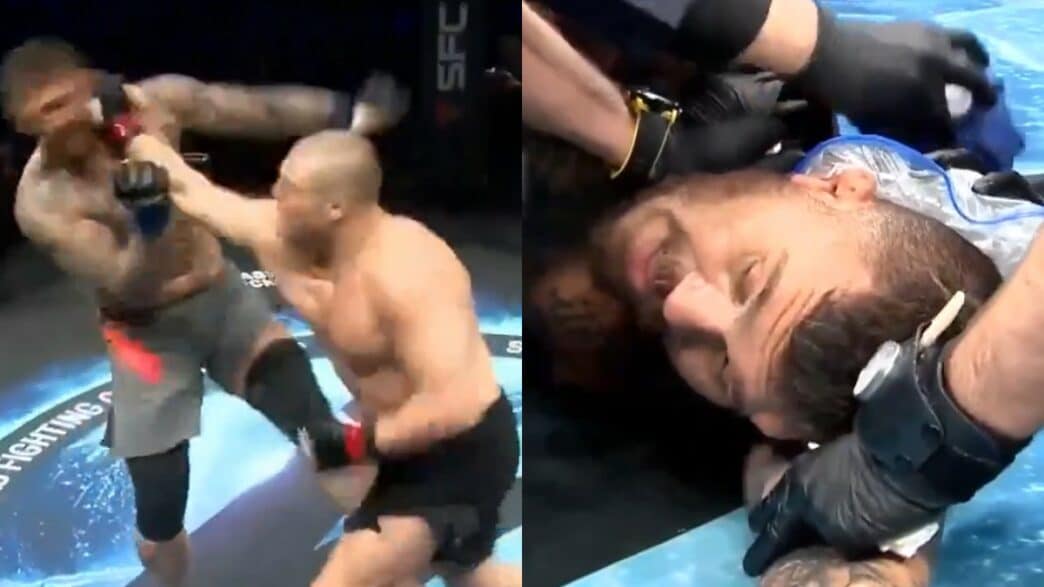 Dmitry Vezhenko ne semble pas se presser pour envoyer des coups. Le Russe lance un premier crochet droit, puis un deuxième. Le troisième aura été celui de trop. Saeed Khamsehzadeh s’écroule au sol après avoir été percuté de plein fouet. Le Russe termine alors brièvement le travail au sol avant d’être arrêté par l’arbitre. L’équipe médicale vient immédiatement aux nouvelles du géant iranien. Celui-ci semble avoir du mal à reprendre ses esprits. Les images de ce KO ont de quoi faire froid dans le dos.